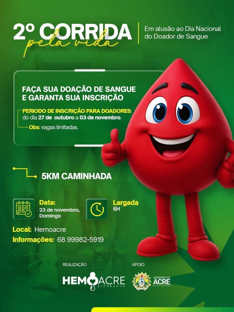 Rio Branco, AC – O Centro de Hematologia e Hemoterapia do Acre (Hemoacre) lançou as inscrições para a 2ª edição da Corrida “Pela Vida”, um evento que une esporte e solidariedade em prol da doação de sangue. A corrida será realizada no dia 23 de novembro de 2025, em Rio Branco, como parte das celebrações da Semana do Doador de Sangue, que culmina no Dia Nacional do Doador de Sangue, em 25 de novembro.