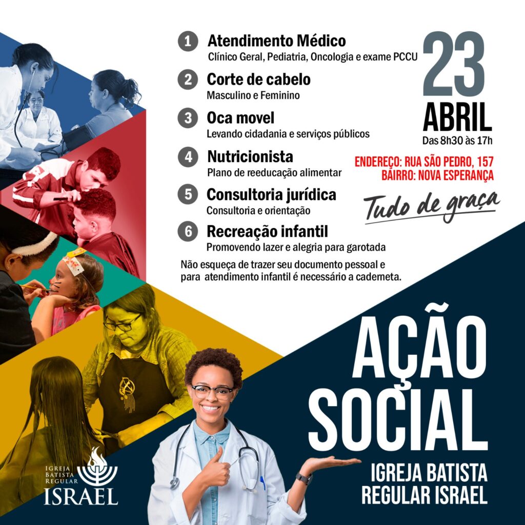 A Igreja Batista Regular Israel estará realizando neste domingo, 23, uma ação social, das 8h30 às 17h, em seu templo localizado na rua São Pedro, nº 157, bairro Nova Esperança.