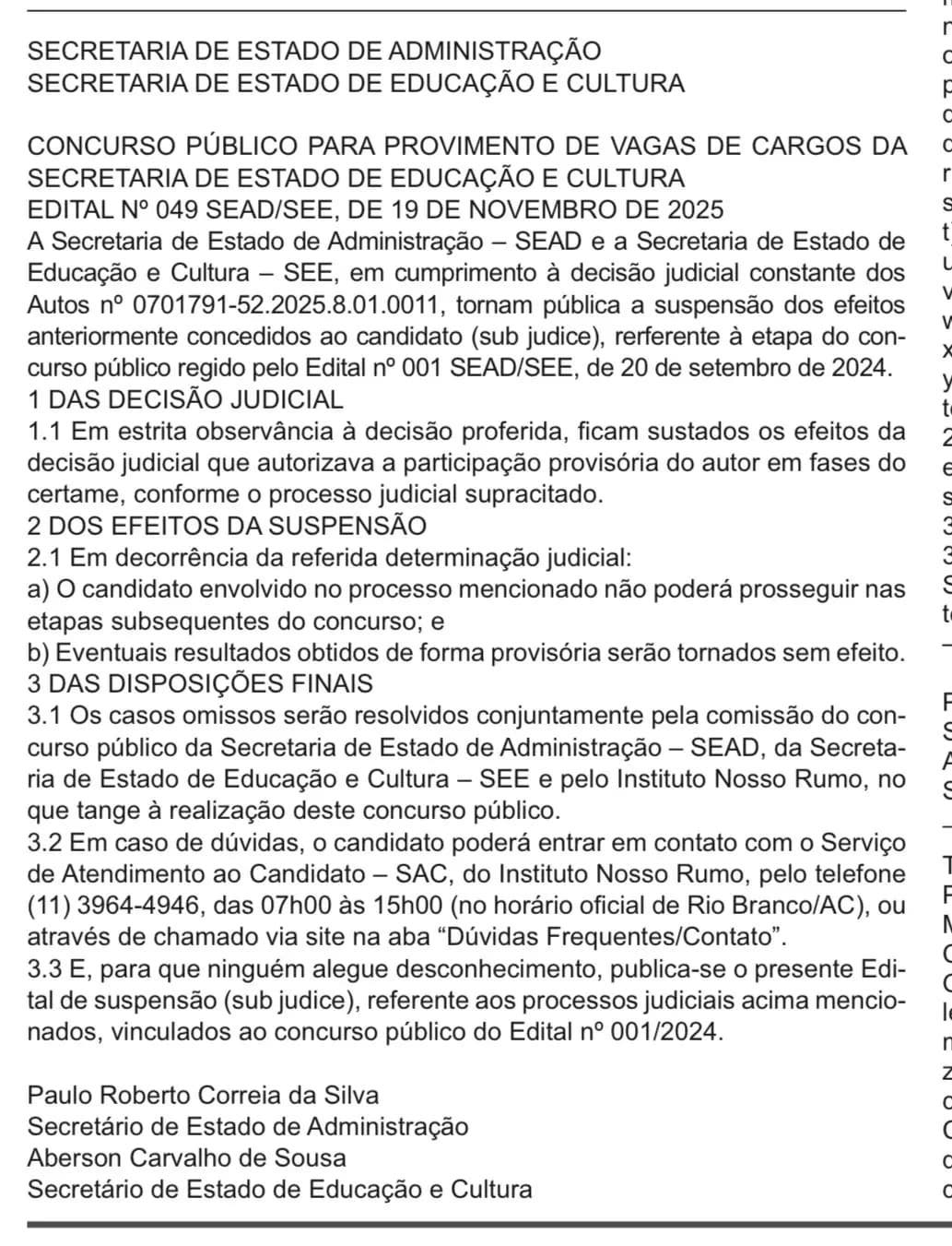 Rio Branco, AC – Em uma reviravolta no concurso da Secretaria de Estado de Educação e Cultura (SEE) do Acre, a Justiça determinou a suspensão da participação de um candidato, conforme publicação no Diário Oficial do Estado (DOE) desta sexta-feira, 21. A decisão judicial revoga uma autorização provisória que havia sido concedida anteriormente, a qual permitia que o concorrente prosseguisse nas fases do certame.