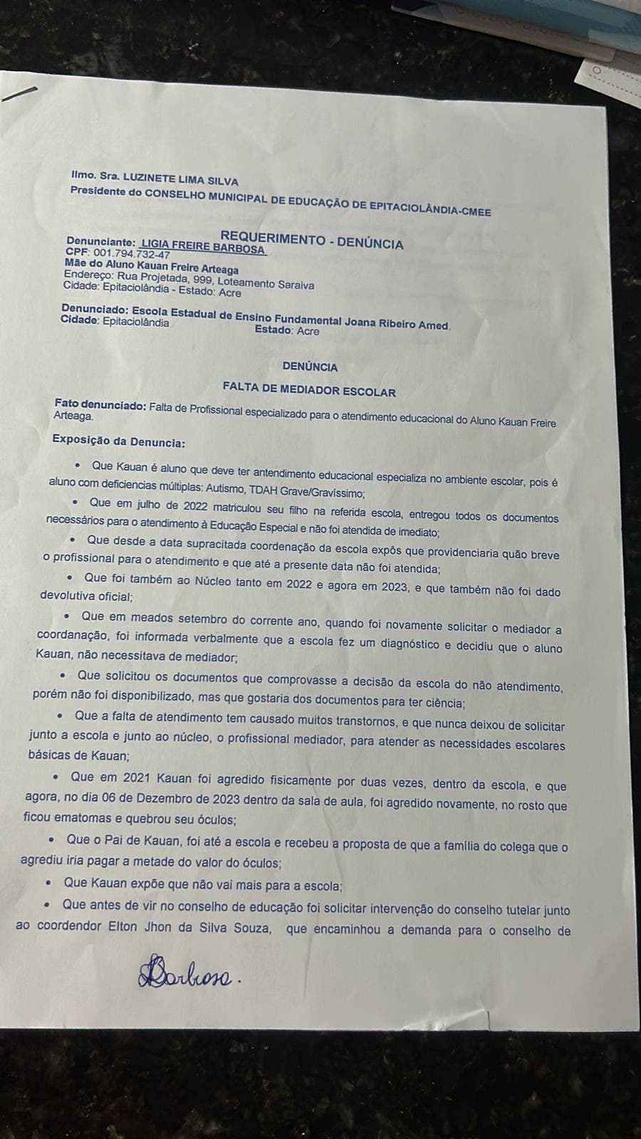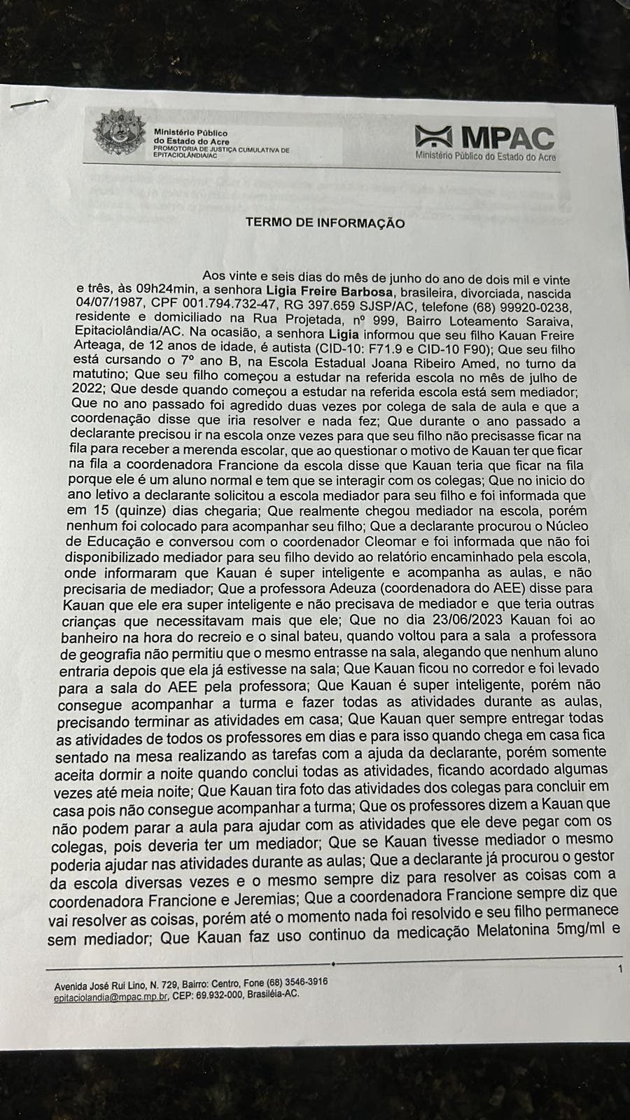 Segundo a mãe, a criança, que estuda na Escola Estadual de Ensino Fundamental e Médio Joana Ribeiro Amed, localizada no município de Epitaciolândia, interior do Acre, tem laudos que pedem que tenha acompanhamento dentro da sala de aula. No entanto, a equipe pedagógica diz que nas avaliações realizadas na unidade educativa apontam que a criança não precisa de um mediador.