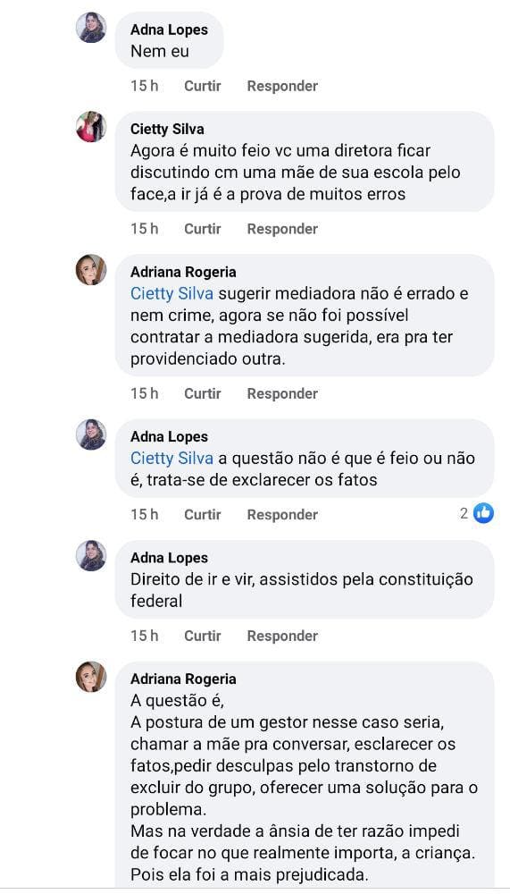 Quando questionada pelo fato de a professora não pedir desculpas para a mãe, Adna respondeu que ligou para mãe e, simplesmente, ela não deixou esses se explicarem e que entende de sua maneira. Ressaltou ainda que a mesma foi adicionada novamente assim que a professora percebeu o que tinha feito.