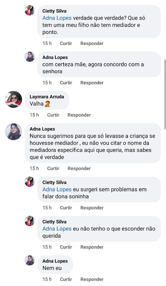 A gestora disse ainda que nunca deixaram de compreender a mãe, que foi feita a busca por mediador e que foram enviados ofícios à secretaria solicitando o pedido. Frisou novamente que a mãe queria uma mediadora do município, que teria uma afinidade maior com a criança, o que é compreensível por parte da mãe que quer o melhor para o filho, mas há hierarquias a ser respeitadas e então não foi possível a contratação pela secretaria.