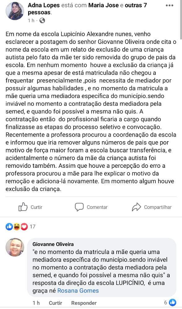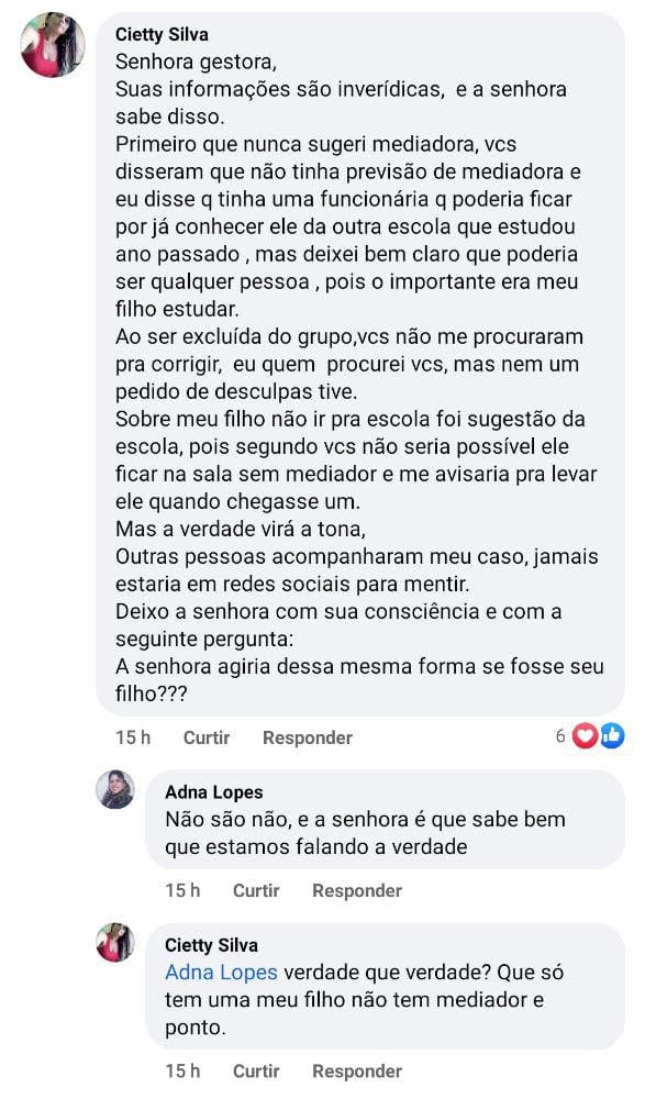 A reportagem também teve acesso a publicação da gestora nas redes sociais, onde não somente a mãe da criança se manifestou, como outras mães de alunos da referida escola.