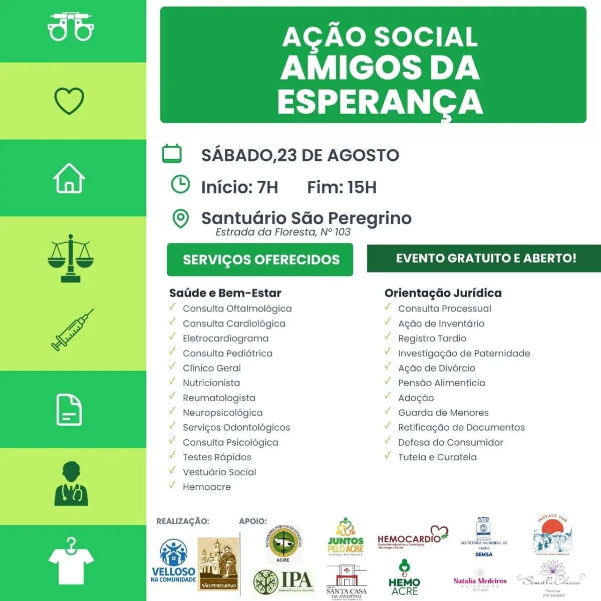 Rio Branco, AC – No próximo sábado, 23 de agosto, o Santuário São Peregrino, em parceria com o deputado federal Eduardo Velloso, promove um grande mutirão de saúde e cidadania, oferecendo serviços gratuitos à população de Rio Branco. O evento, intitulado “Amigos da Esperança”, será realizado das 7h às 15h, na Estrada da Floresta, nº 103.
