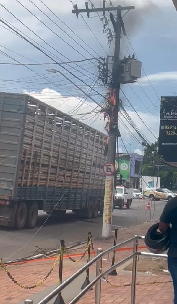 Um poste de energia elétrica, localizado na Avenida Getúlio Vargas, bairro Bosque, Rio Branco (AC), incendiou após um caminhão, que passava na via arrastar a fiação elétrica.
