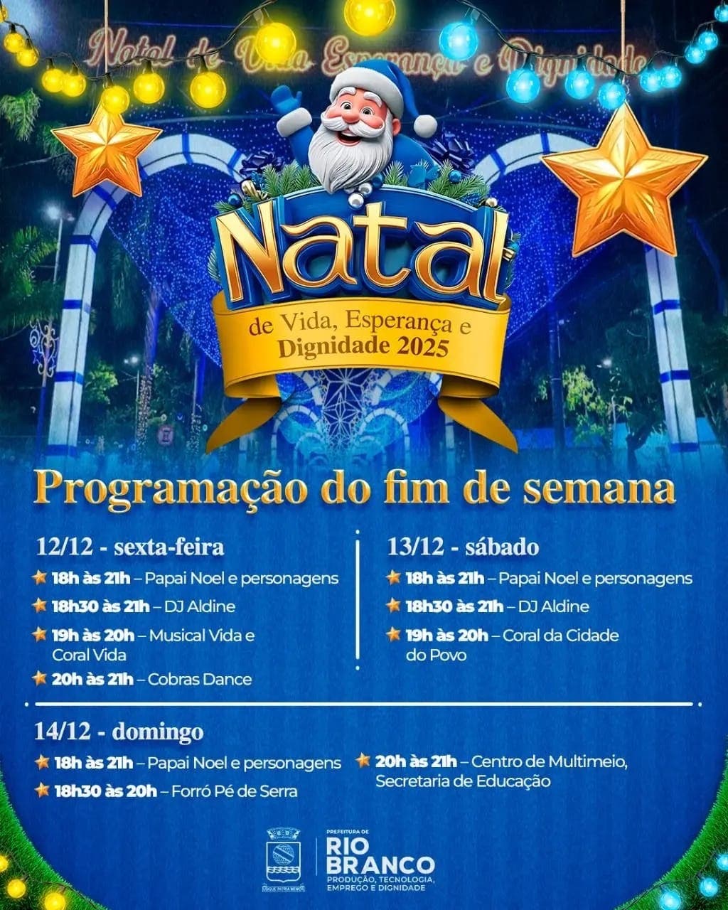 Sexta-feira, 12 de dezembro (Rio Branco) — O evento “Natal de Vida, Esperança e Dignidade 2025”, promovido pela Prefeitura de Rio Branco, preparou um fim de semana cheio de atrações para toda a família. A programação, que vai de hoje (12) a domingo (14), inclui música, dança, a presença do Papai Noel — e ônibus de transporte coletivo circularão gratuitamente para facilitar o acesso às apresentações.