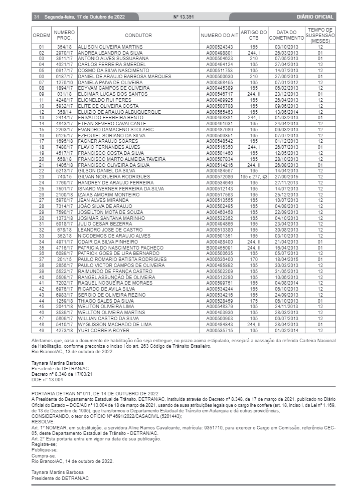 O Departamento Estadual de Trânsito (Detran/AC) publicou no Diário Oficial do Acre, na edição desta segunda-feira (17), um edital de notificação para 49 condutores que podem ter o direito de dirigir suspenso por cometimento de infrações de trânsito.