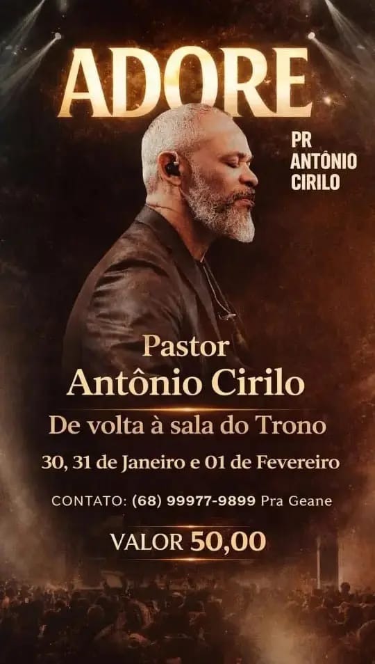 RIO BRANCO (AC) – Rio Branco receberá nos próximos dias um dos principais nomes da adoração cristã nacional: o pastor e cantor Antônio Cirilo estará presente no evento “Adore – De volta à sala do Trono”, que ocorrerá nos dias 30 e 31 de janeiro e 1º de fevereiro. O encontro promete reunir fiéis de diferentes denominações para momentos de louvor, ministração e reflexão espiritual.