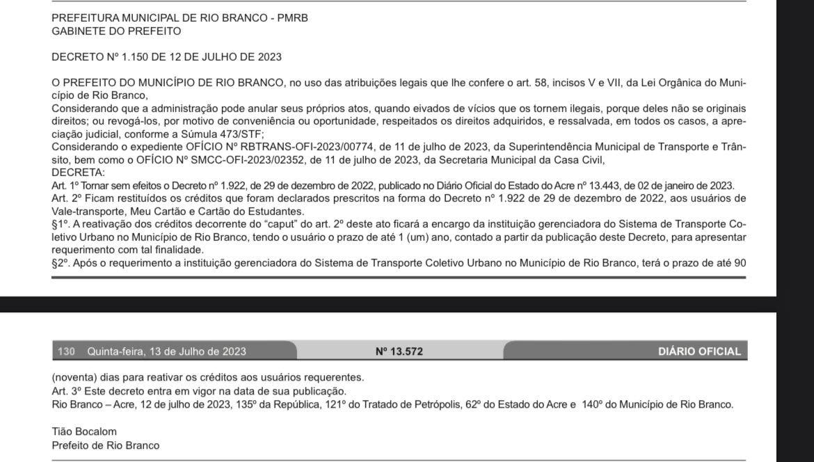 A prefeitura de Rio Branco publicou no Diário Oficial desta quinta-feira, 13, o decreto de Nº 1.150 onde torna sem efeitos o Decreto nº 1.922, de 29 de dezembro de 2022, publicado no Diário Oficial do Estado do Acre n° 13.443, de 02 de janeiro de 2023.