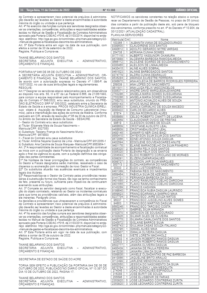 O Diário Oficial do Estado do Acre registrou nesta terça-feira, 11, uma lista com mais de 180 nomes de servidores ativos da Secretaria de Saúde (Sesacre) que devem fazer a atualização cadastral anual este mês.