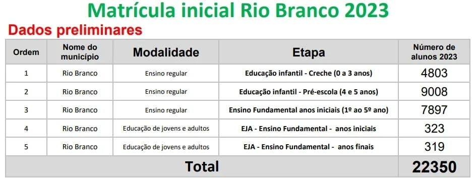 A Prefeitura de Rio Branco encerrou o ano letivo de 2023 em janeiro de 2024, projetando uma disputa por vagas ainda maior para o próximo ano letivo. A Secretaria Municipal de Educação informou que, devido à melhoria do padrão de serviço oferecido pela rede pública, espera-se um aumento significativo no número de matrículas. Atualmente, a rede municipal de ensino na capital atende mais de 22 mil alunos, abrangendo creches, pré-escolas, ensino fundamental (do primeiro ao quinto ano) e o programa de educação de jovens e adultos (EJA).
