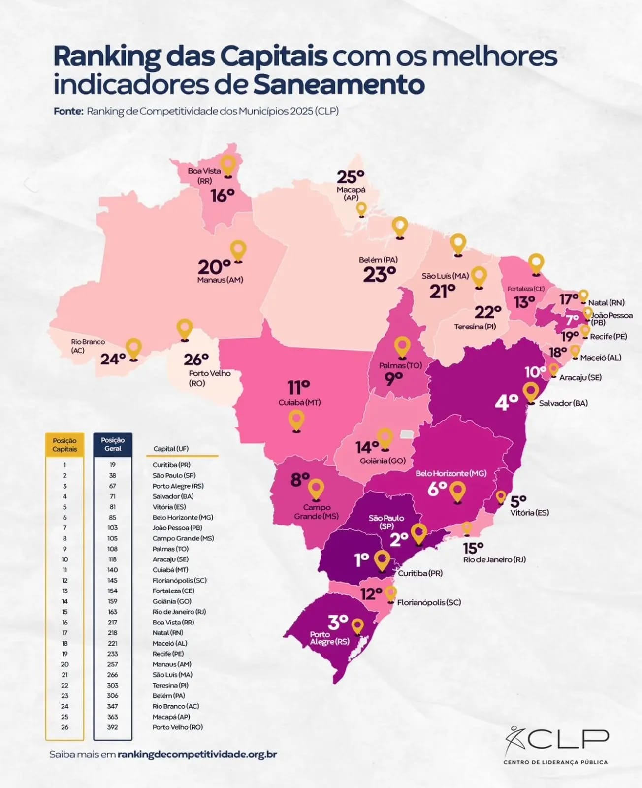 Curitiba (PR) é a capital com melhor desempenho em saneamento do país, seguida por São Paulo (SP) e Porto Alegre (RS) – todas do Sul e Sudeste, regiões que concentram as melhores classificações do pilar. Já nas últimas posições aparecem Macapá (AP) e Porto Velho (RO), que figura como a pior capital do país no quesito há dez anos consecutivos, segundo o Instituto Trata Brasil.