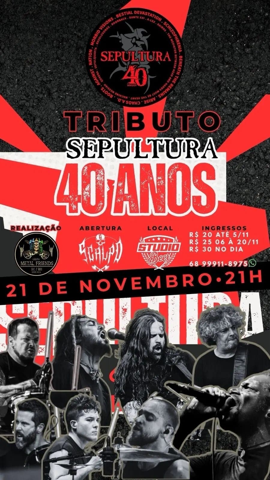 Rio Branco, AC – 21 de novembro de 2025 – O Studio Beer, em Rio Branco, será palco de uma celebração épica nesta sexta-feira, 21 de novembro, às 21h, em homenagem aos 40 anos de carreira do Sepultura, a banda brasileira de maior projeção mundial no cenário do metal. O tributo “Sepultura 40 Anos” reunirá músicos acreanos e a renomada banda local Scalpo para revisitar todas as fases da trajetória da banda mineira que revolucionou o metal extremo.