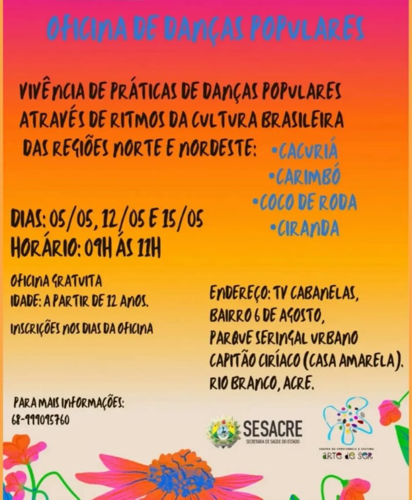 Prepare-se para movimentar o corpo e celebrar a cultura brasileira! Rio Branco recebe em maio uma oficina gratuita de danças populares, uma imersão vibrante nos ritmos do Norte e Nordeste do país. A oficina, que acontece nos dias 5, 12 e 15 de maio, das 9h às 11h, oferece a chance única de aprender e vivenciar danças tradicionais como o Cacuriá, Carimbó, Coco de Roda e Ciranda.