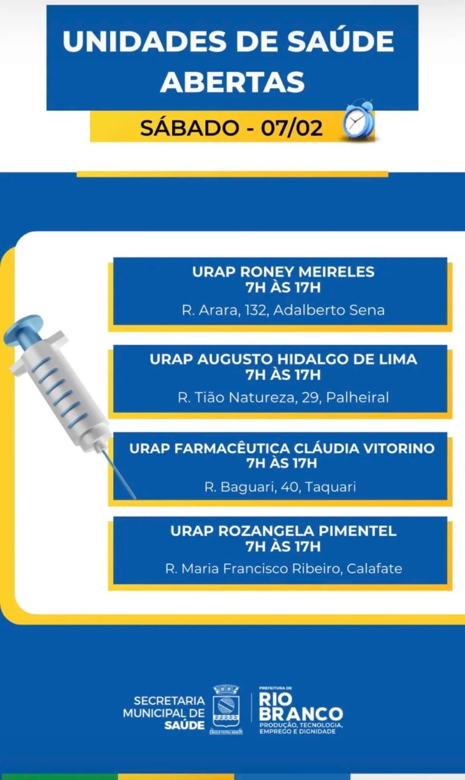 RIO BRANCO (AC) – A Prefeitura de Rio Branco garantirá o acesso à assistência médica primária para a população neste sábado (7), mantendo quatro Unidades de Referência de Atenção Primária (URAPs) em funcionamento das 7h às 17h. As unidades foram distribuídas em diferentes regiões da capital acreana, facilitando o deslocamento dos moradores que precisarem de atendimento.