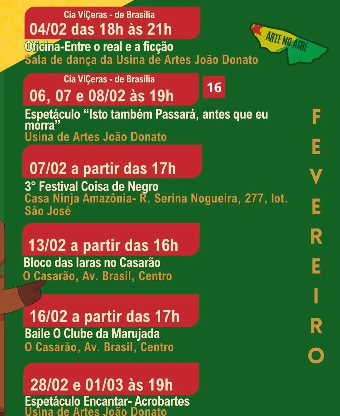 RIO BRANCO (AC), 03 de fevereiro de 2026 – Além da agitação do carnaval, o mês de fevereiro reserva uma agenda cultural intensa e variada para os moradores e visitantes de Rio Branco. Divulgada pelo perfil Arte no Acre, a programação reúne teatro, dança, oficinas, festivais e espetáculos em pontos estratégicos da capital acreana, atendendo públicos de diferentes idades e interesses ao longo de todo o período.