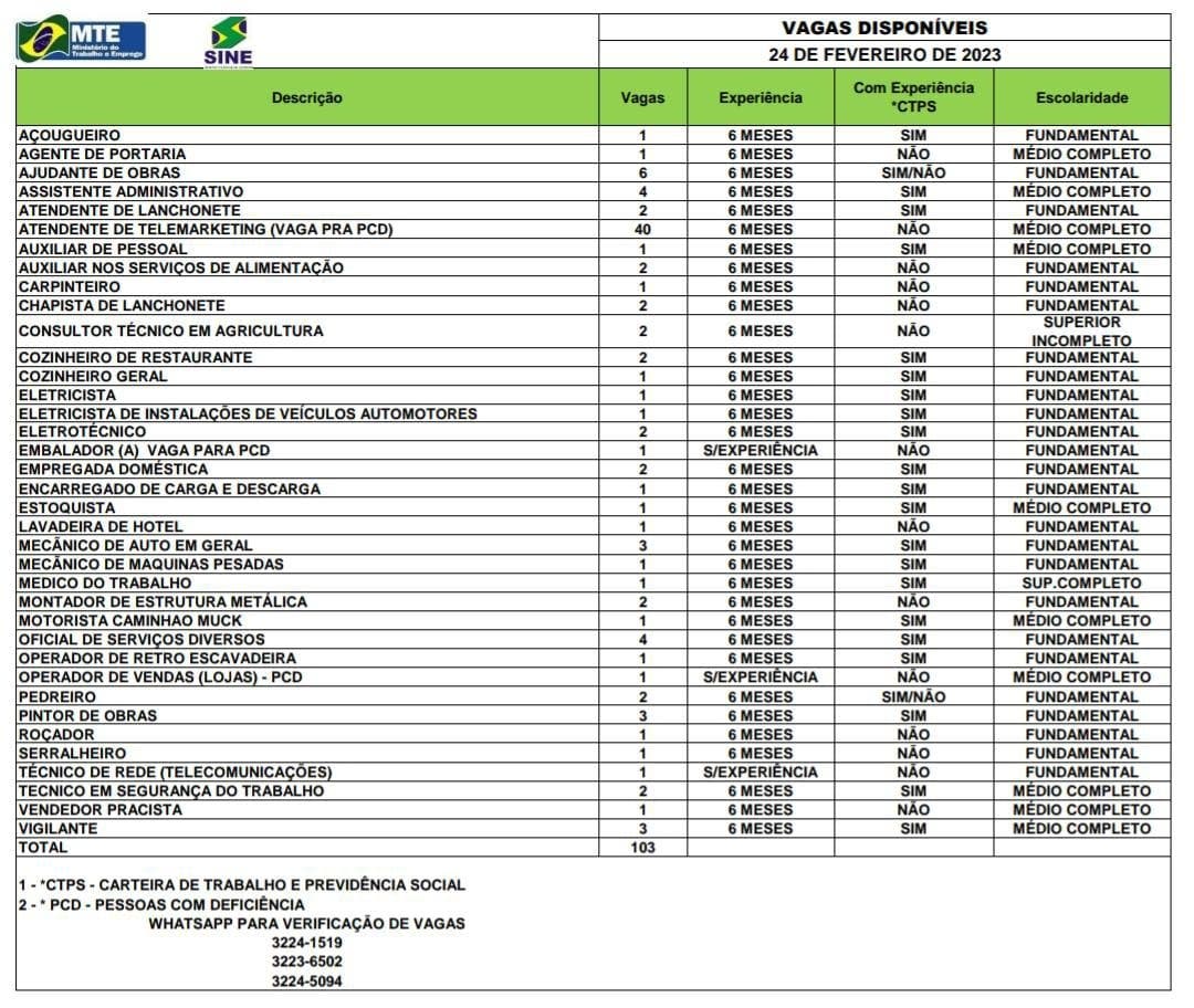 Para quem já possui cadastro e tem interesse em umas das vagas, podem entrar em contato por meio do Whatsapp nos números: (68) 3223-6502; (68) 3224-5094; (68) 3224-1519 ou 0800 647-8182.