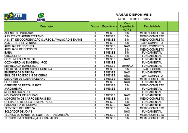 As vagas disponíveis são para os cargos de agente de portaria, assistente administrativo, assistente de vendas, auxiliar de costura, auxiliar de depósito, babá, circuleiro, costureira em geral, cozinheira em geral (PCD), empregada doméstica, empregada doméstica faxineira, empregada diarista, eng. de projetos e de obras, design de sobrancelhas, ferreiro, gerente de restaurante, jardineiro, merendeira (PCD), moldadora de roupas, motorista de carro de passeio, operador de rolo compactador, passadeira de roupas, servente de limpeza, soldador de jóias, técnico de manutenção de equipamentos de transmissão, técnico em segurança do trabalho, trabalhador rural, tratorista agrícola, vendedor de serviços, vendedor interno e zelador.