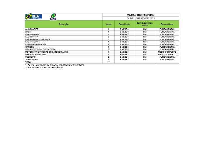 As vagas disponíveis são para almoxarife, babá, carpinteiro, eletricista, empregada doméstica, encanador, ferreiro armador, garçom, mecânico de auto em geral, motorista entregador categoria (AB), operador de caixa, pedreiro e topógrafo.