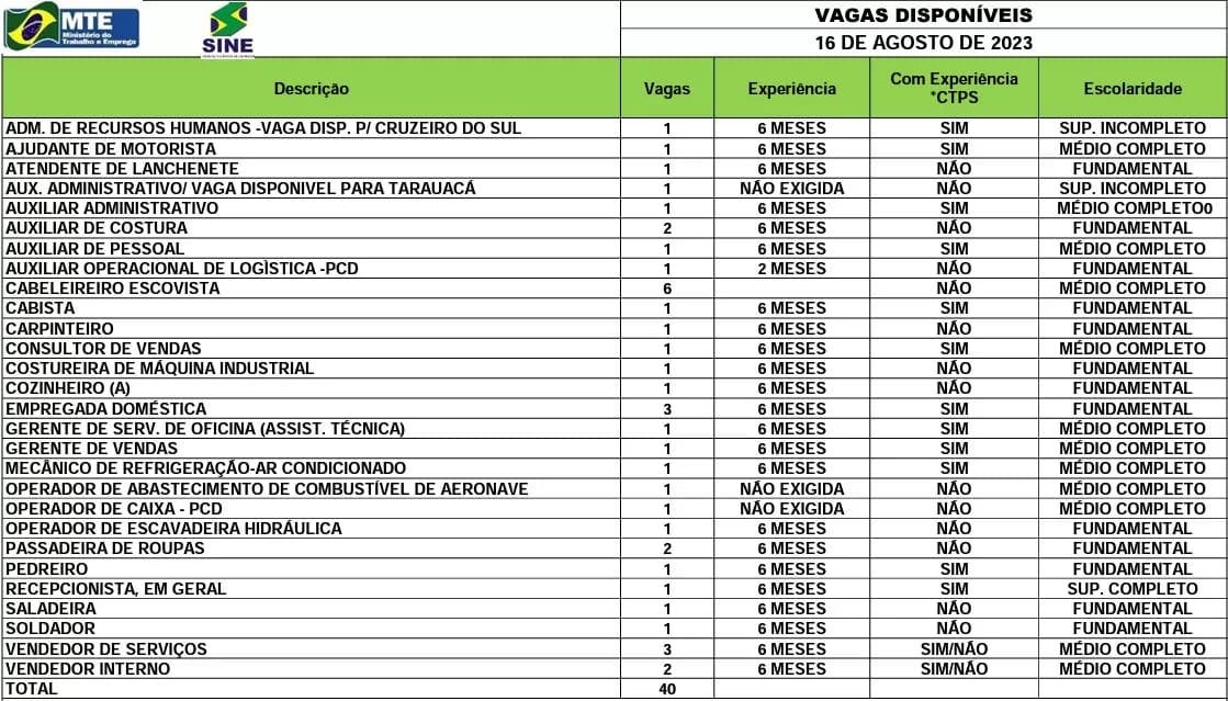 O Sistema Nacional de Empregos do Acre (Sine), está disponibilizando 40 vagas de emprego para várias áreas em Rio Branco, nesta quarta-feira, 16 de agosto.