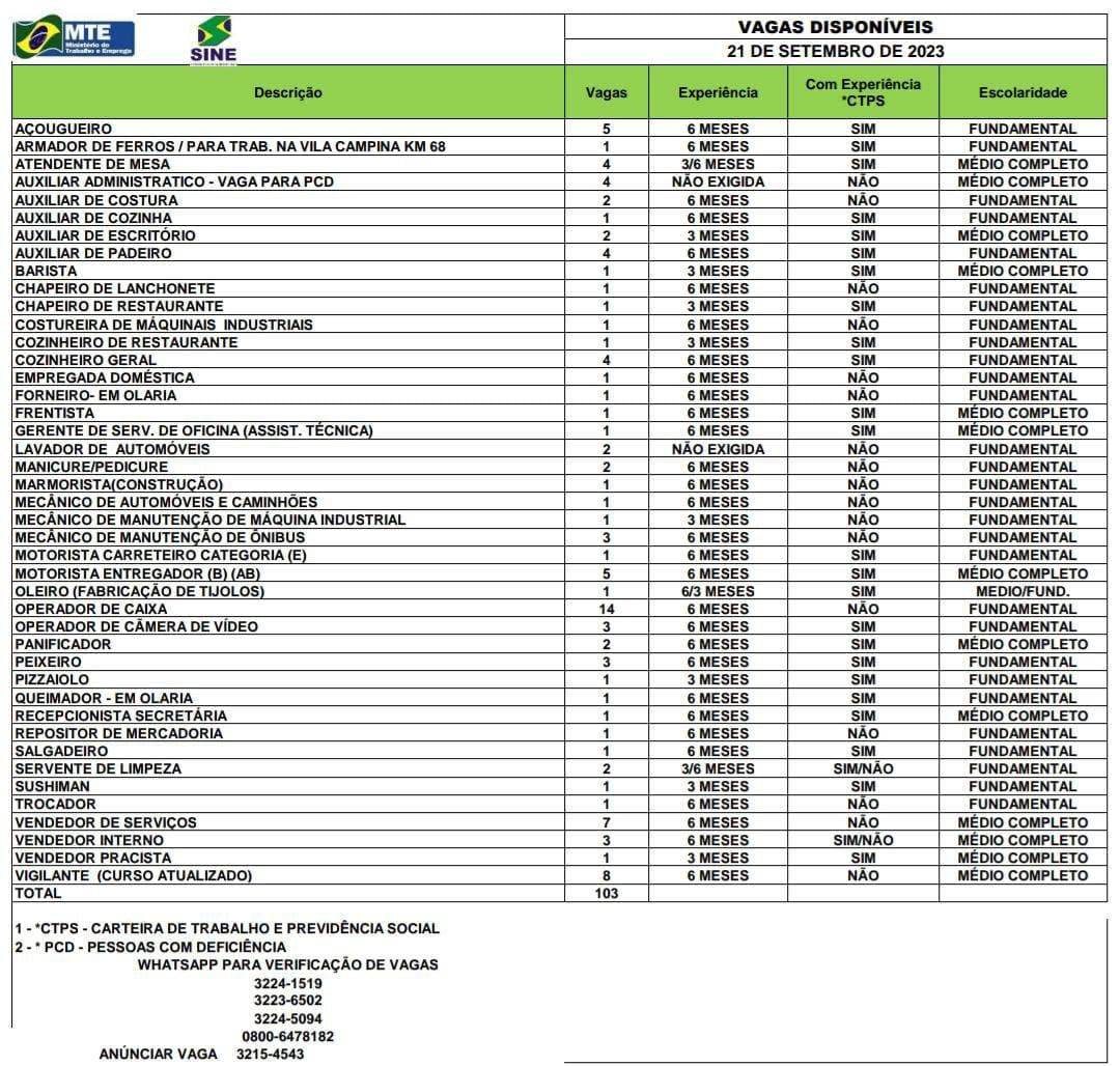 O Sistema Nacional de Emprego do Acre (Sine), está ofertando 103 vagas de emprego para esta quinta-feira, 21. Dessas, 62 são para quem possui nível fundamental, 40 para nível médio e 1 para quem tem fundamental/médio.