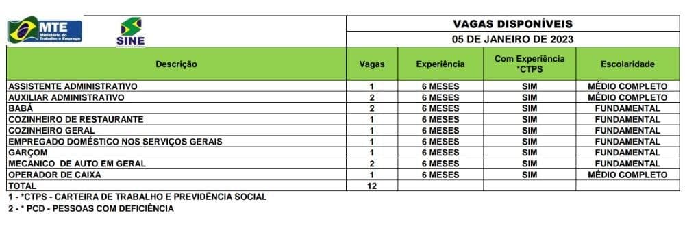 O Sistema Nacional de Emprego do Acre (Sine), está ofertando 12 vagas de emprego para esta quinta-feira, 05. Dessas, oito vagas são para quem possui nível fundamental e quatro para nível médio.
