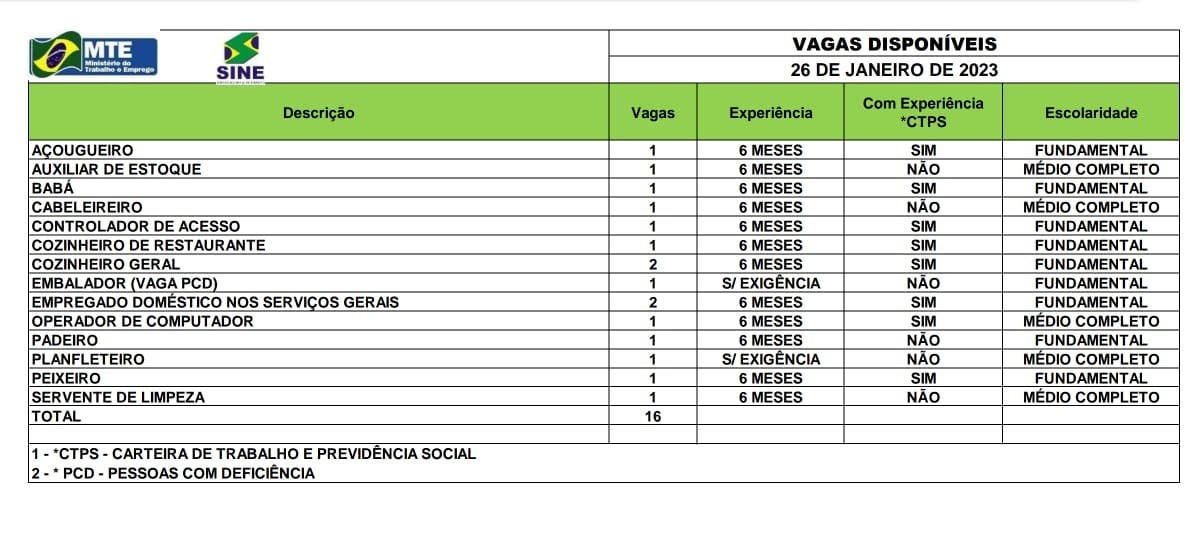 O Sistema Nacional de Emprego do Acre (Sine), está ofertando 16 vagas de emprego para esta quinta-feira, 26. Dessas, 11 são para quem possui nível fundamental e cinco para nível médio. Além disso, uma vaga é destinada para pessoa com deficiência (pcd).