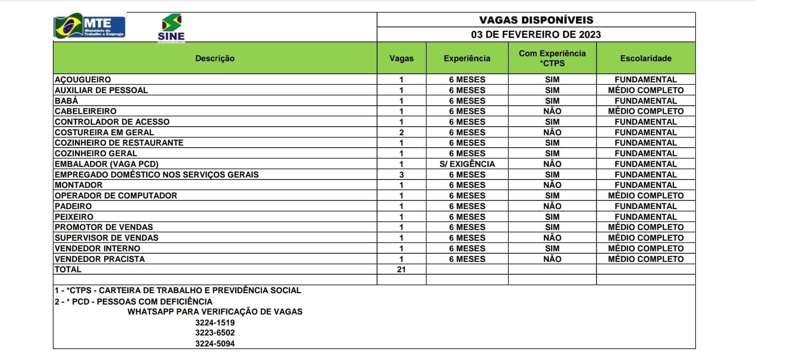 Para quem já possui cadastro e tem interesse em umas das vagas, podem entrar em contato por meio do WhatsApp nos números: (68) 3223-6502; (68) 3224-5094; (68) 3224-1519 ou 0800 647-8182.