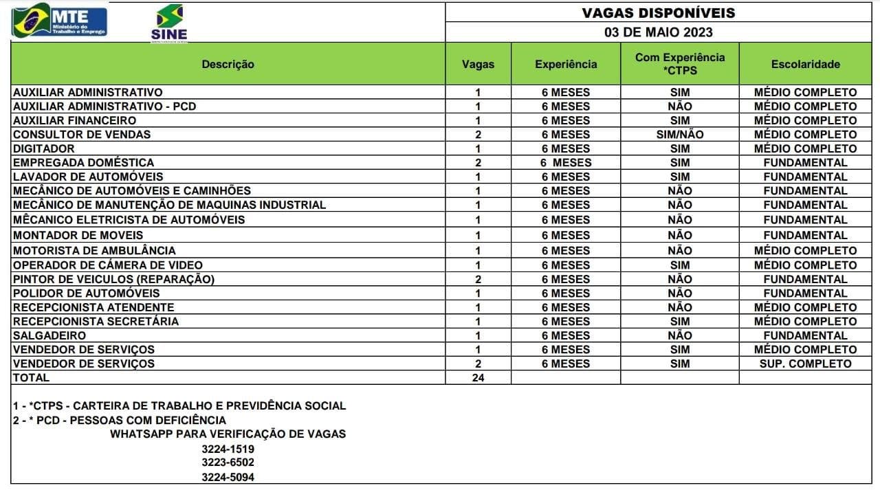 O Sistema Nacional de Emprego do Acre (Sine), está ofertando 24 vagas de emprego para esta quarta-feira, 03. Dessas, 11 são para quem possui nível fundamental, 11 para nível médio e duas para nível superior. Além disso, uma vaga para auxiliar administrativo é destinada para pessoa com deficiência (PCD).