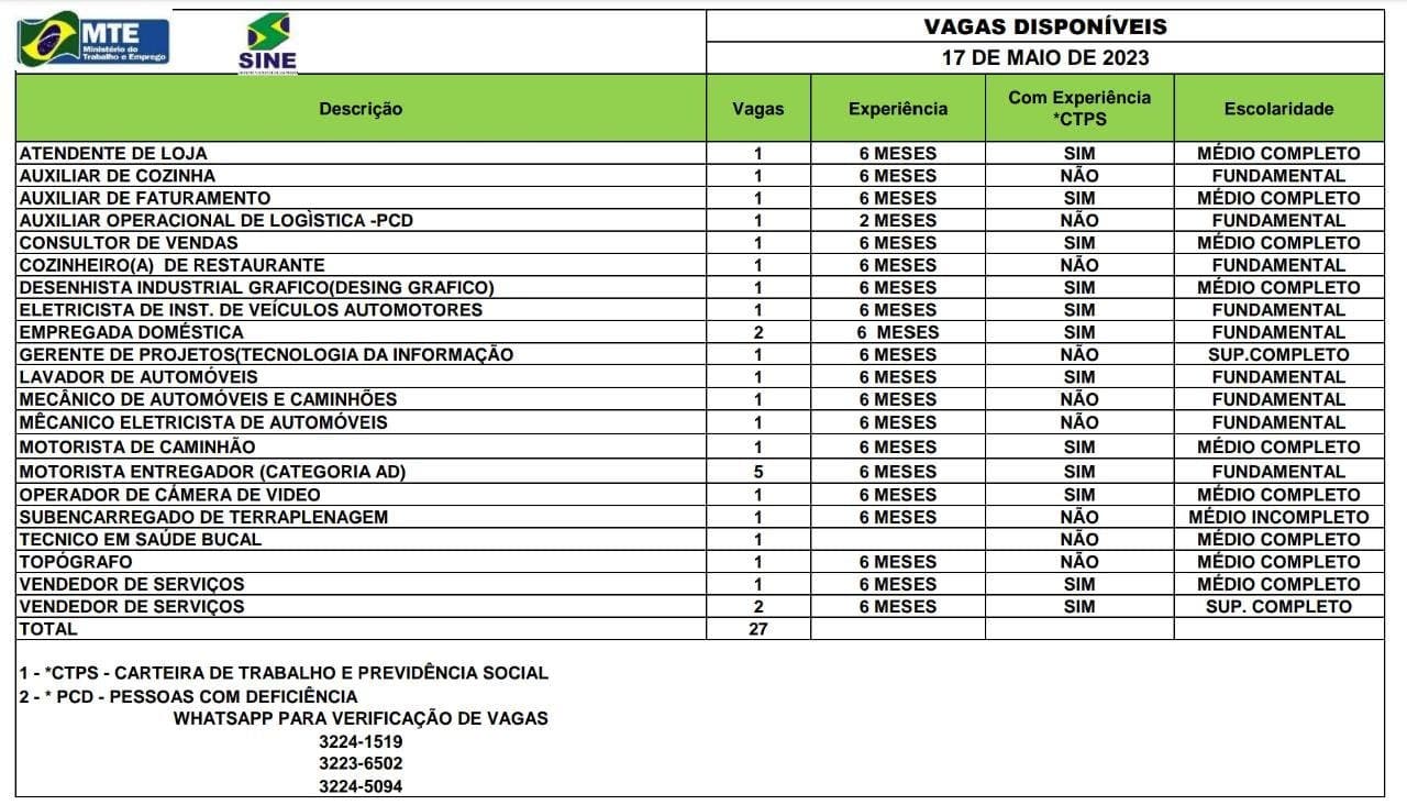 Para quem já possui cadastro e tem interesse em umas das vagas, podem entrar em contato por meio do WhatsApp nos números: (68) 3223-6502; (68) 3224-5094; (68) 3224-1519 ou 0800 647-8182.