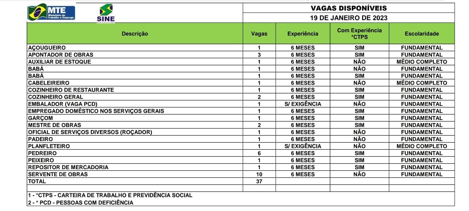 O Sistema Nacional de Emprego do Acre (Sine), está ofertando 37 vagas de emprego para esta quinta-feira, 19. Dessas, 34 são para quem possui nível fundamental e três para nível médio. Além disso, uma vaga é destinada para pessoa com deficiência (pcd).