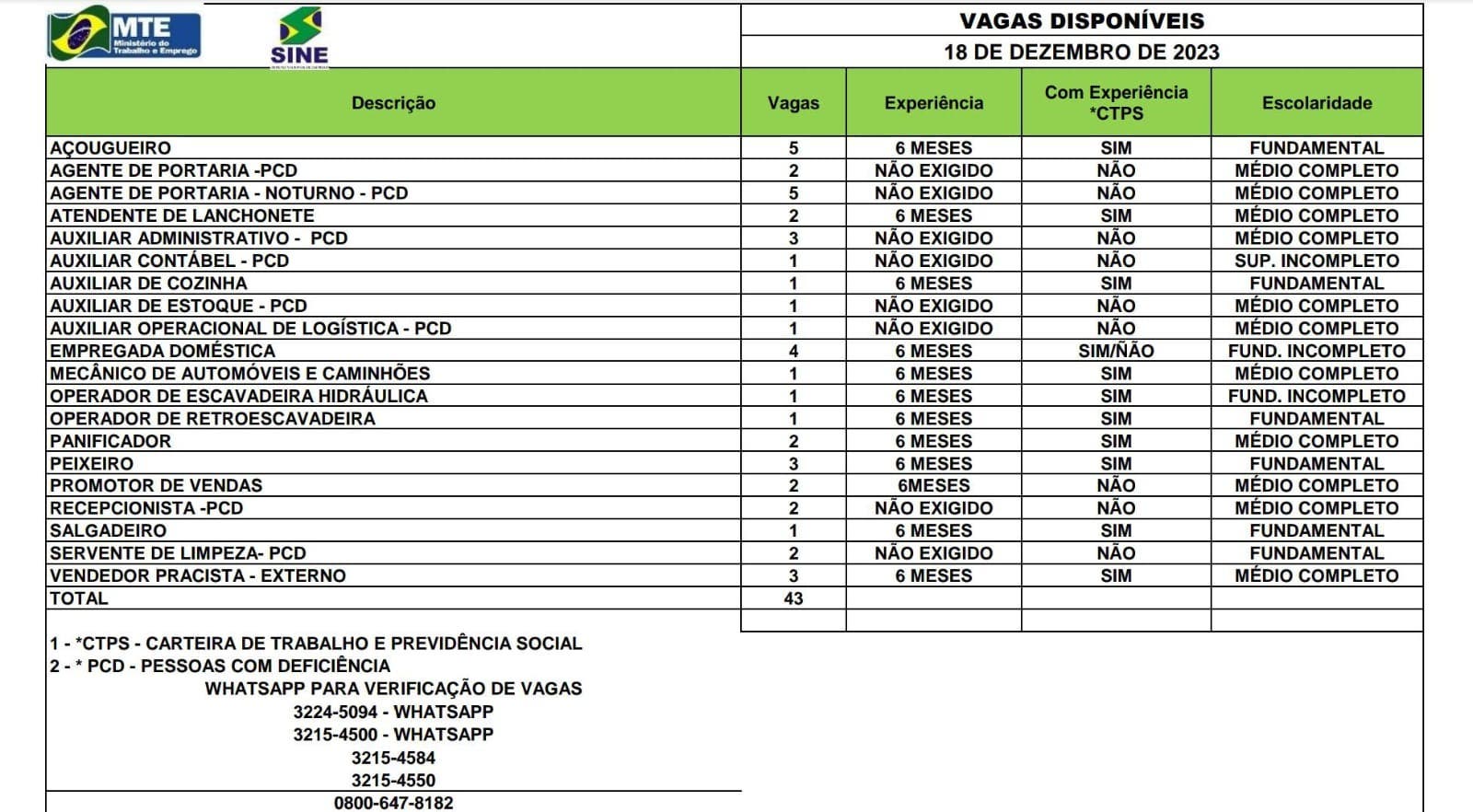 Sine oferta 43 vagas de emprego para Rio Branco nesta segunda-feira, 18