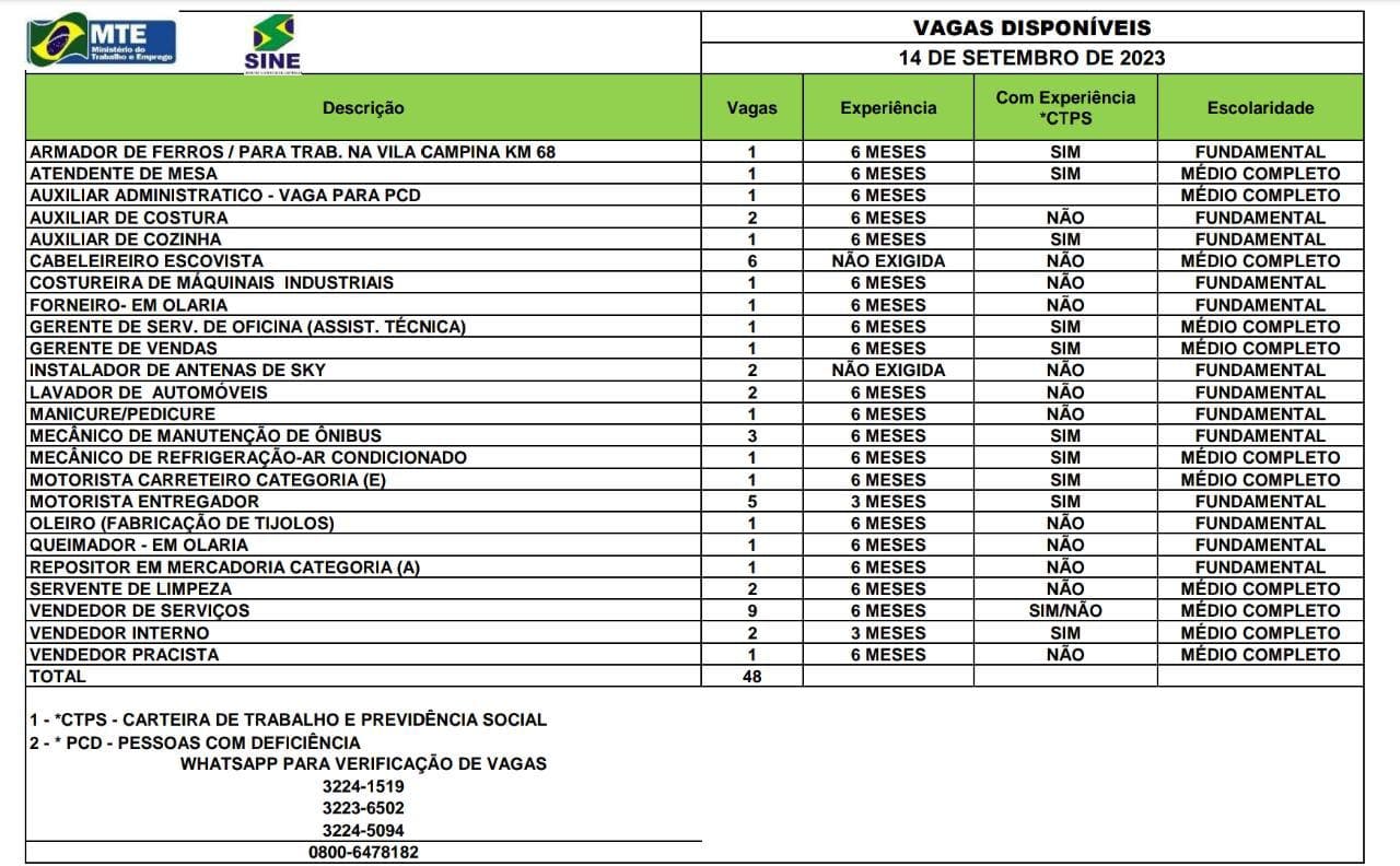 O Sistema Nacional de Emprego do Acre (Sine), está ofertando 48 vagas de emprego para esta quinta-feira,14. Dessas, 22 são para quem possui nível fundamental e 26 para nível médio.