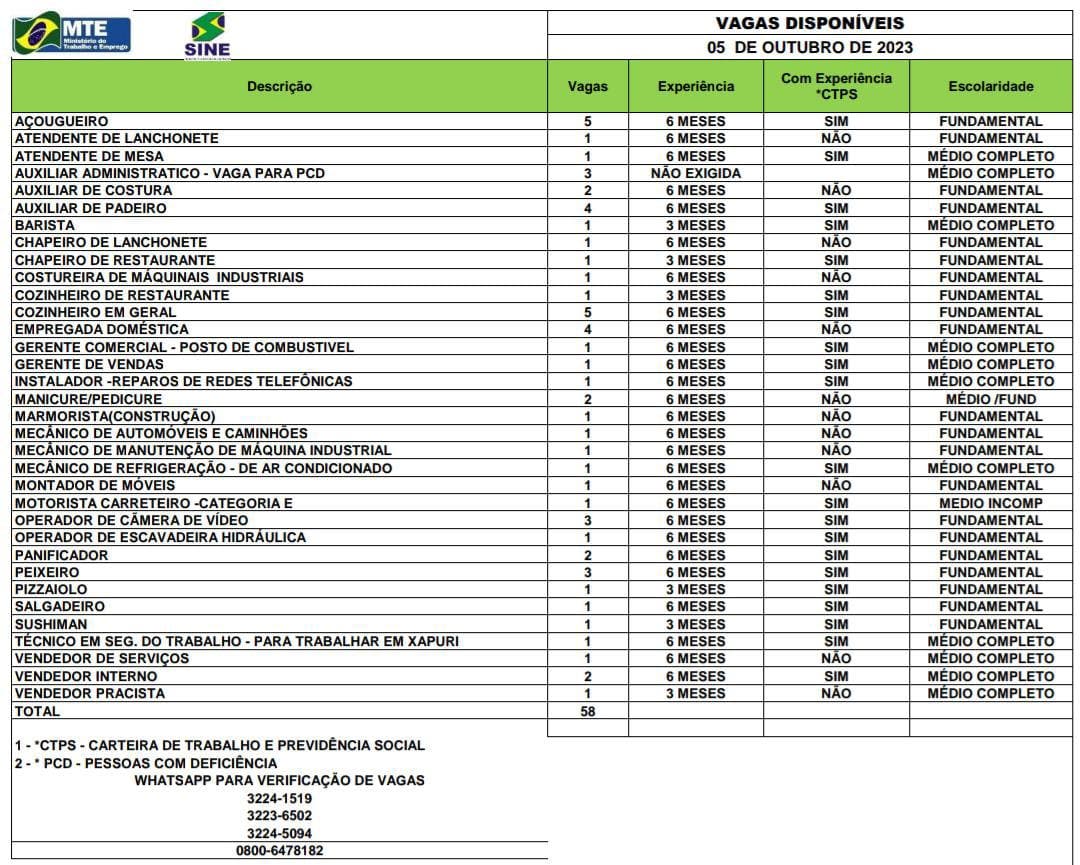 O Sistema Nacional de Emprego do Acre (Sine), está ofertando 58 vagas de emprego para Rio Branco e Xapuri (AC) nesta quinta-feira, 4. Dessas, 41 são para quem possui nível fundamental, 15 para nível médio e 2 para quem tem fundamental/médio.