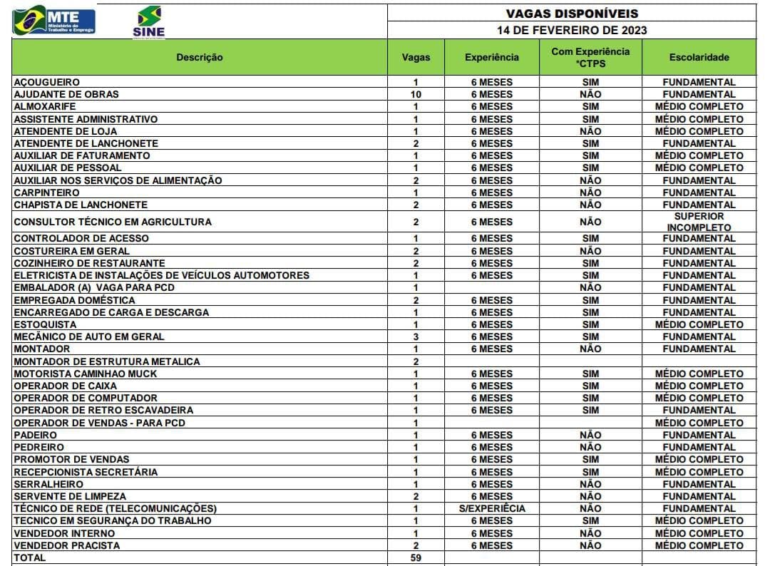 O Sistema Nacional de Emprego do Acre (Sine), está ofertando 59 vagas de emprego para esta terça-feira, 14. Dessas, 39 são para quem possui nível fundamental, 16 para nível médio, duas para nível superior incompleto e duas não exigem grau de escolaridade. Além disso, duas destas vagas são destinadas para pessoa com deficiência (pcd).