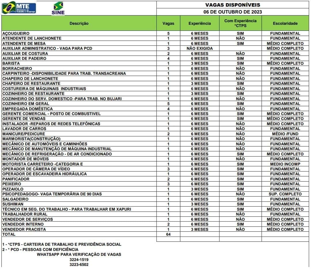 Sine oferta 64 vagas de emprego para Rio Branco, Transacreana, Bujari e Xapuri nesta sexta-feira, 6