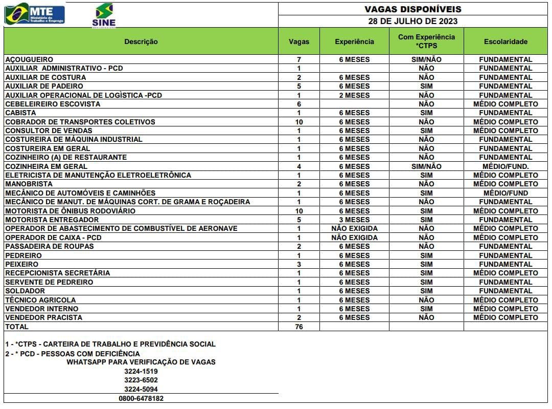 O Sistema Nacional de Emprego do Acre (Sine), está ofertando 76 vagas de emprego para esta sexta-feira, 28. Dessas, 34 são para quem possui nível fundamental, 37 para nível médio, 6 para quem tem nível fundamental ou médio. Além disso, 3 dessas vagas são para Pessoa com Deficiência (PcD).