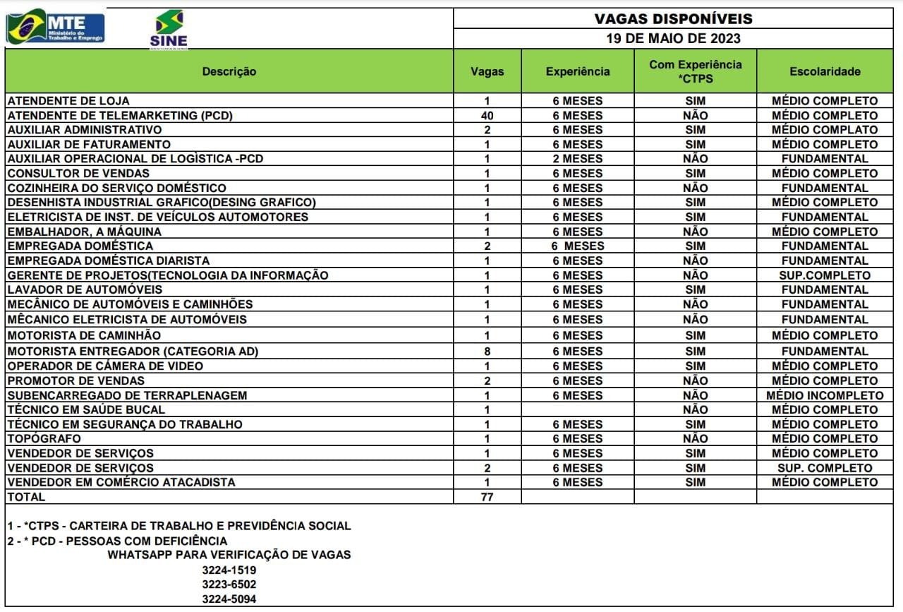 Para quem já possui cadastro e tem interesse em umas das vagas, podem entrar em contato por meio do WhatsApp nos números: (68) 3223-6502; (68) 3224-5094; (68) 3224-1519 ou 0800 647-8182.