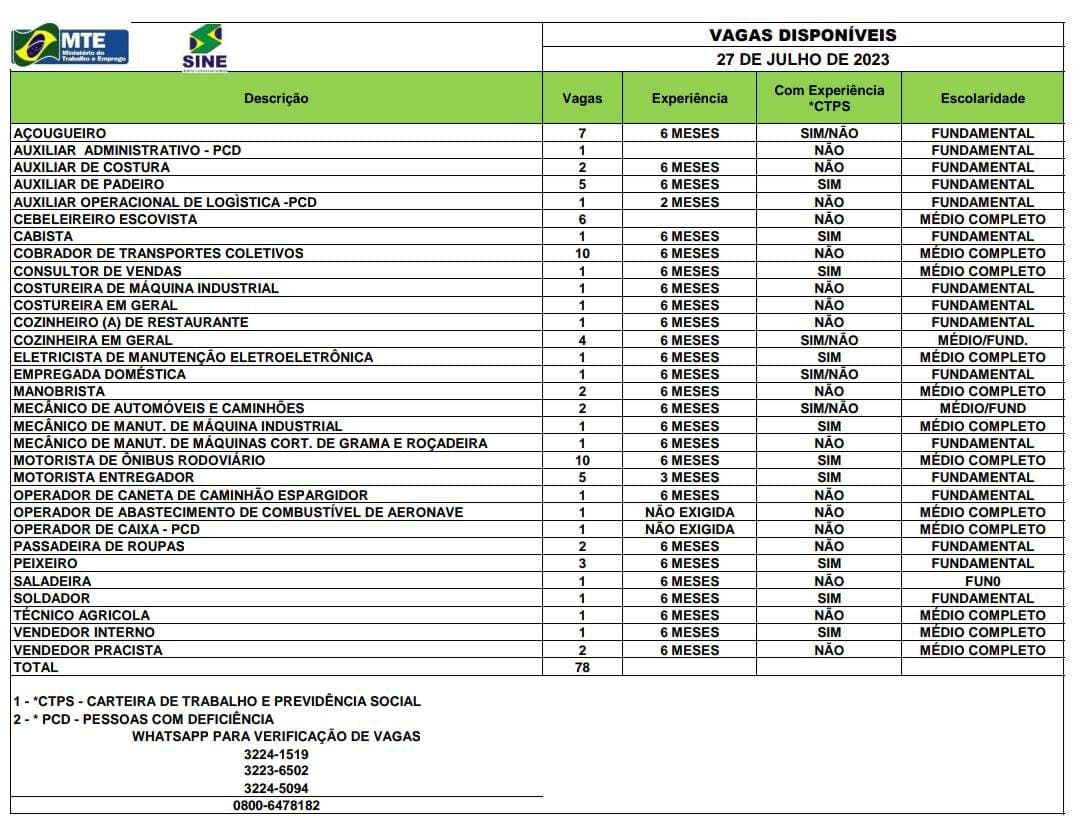 O Sistema Nacional de Emprego do Acre (Sine), está ofertando 83 vagas de emprego para esta quinta-feira, 27. Dessas, 35 são para quem possui nível fundamental, 37 para nível médio, 6 para quem tem nível fundamental ou médio. Além disso, 3 dessas vagas são para Pessoa com Deficiência (PcD).