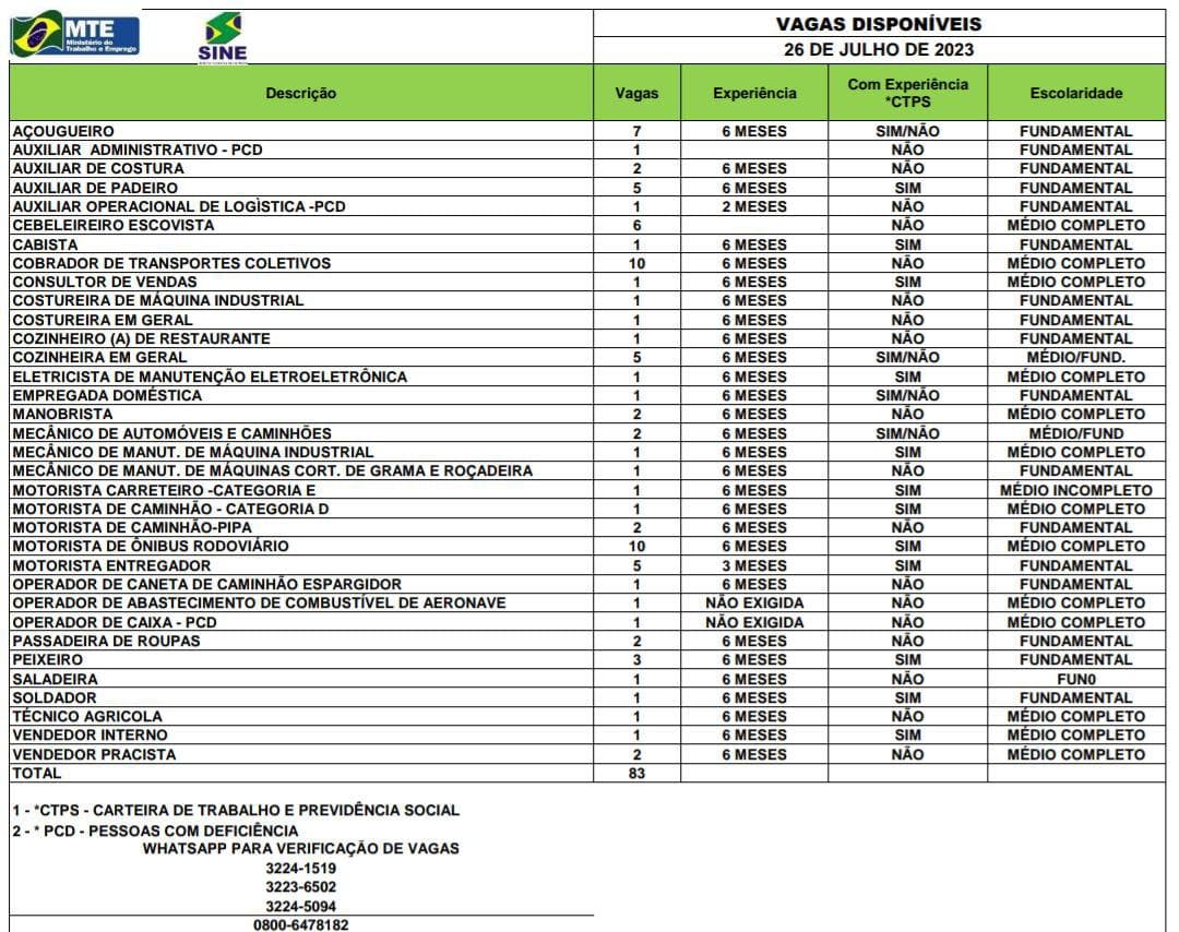 O Sistema Nacional de Emprego do Acre (Sine), está ofertando 83 vagas de emprego para esta quarta-feira, 26. Dessas, 37 são para quem possui nível fundamental, 39 para nível médio, 7 para quem tem nível fundamental ou médio. Além disso, 3 dessas vagas são para Pessoa com Deficiência (PcD).