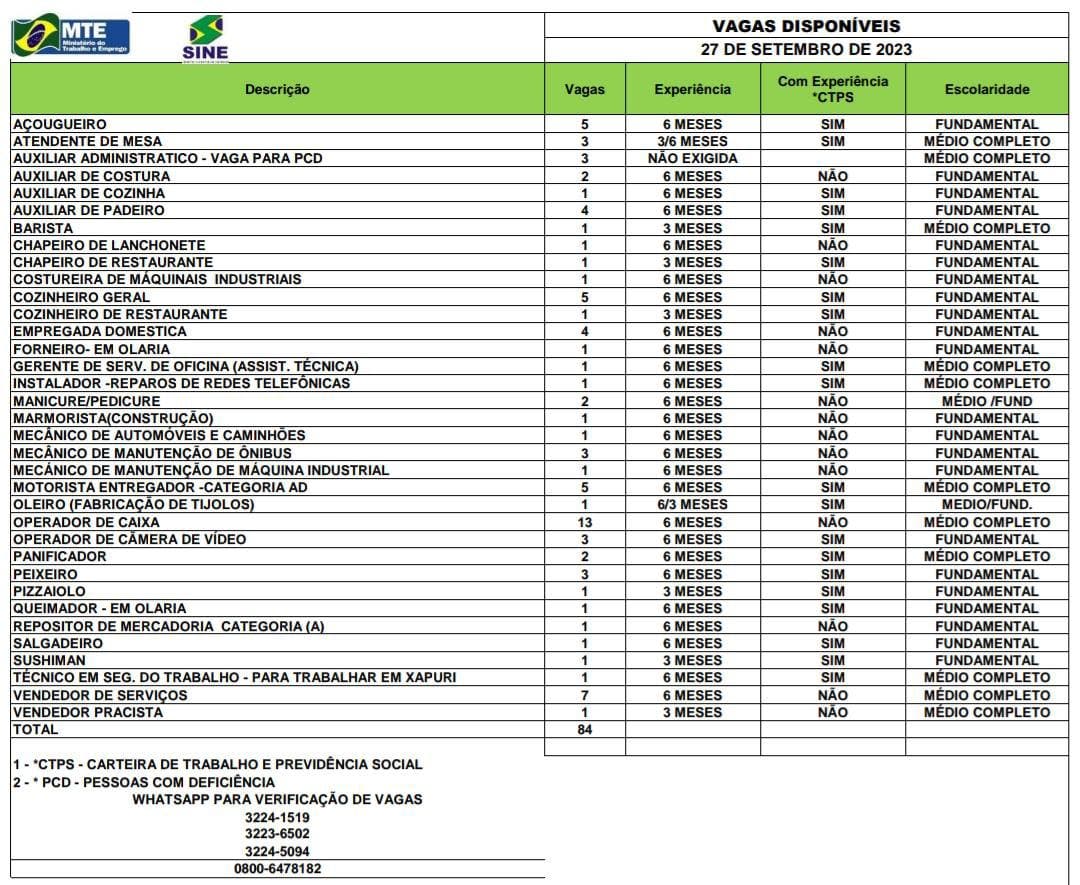 O Sistema Nacional de Emprego do Acre (Sine), está ofertando 84 vagas de emprego para Rio Branco e Xapuri (AC) nesta quarta-feira, 27. Dessas, 43 são para quem possui nível fundamental, 40 para nível médio e 1 para quem tem fundamental/médio.