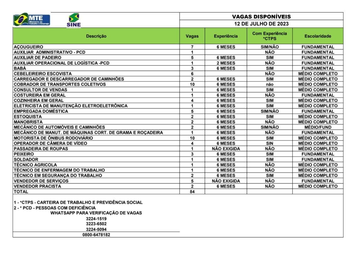 Sine oferta 84 vagas de emprego para Rio Branco nesta quarta-feira, 12