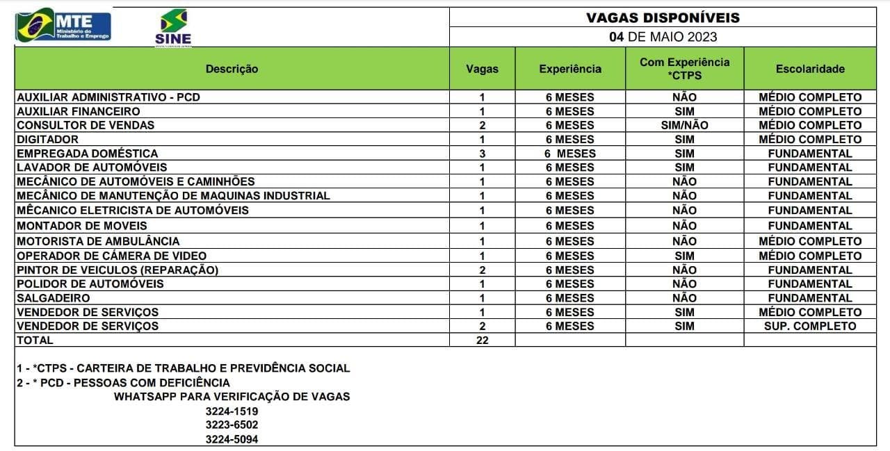 Para quem já possui cadastro e tem interesse em umas das vagas, podem entrar em contato por meio do WhatsApp nos números: (68) 3223-6502; (68) 3224-5094; (68) 3224-1519 ou 0800 647-8182.