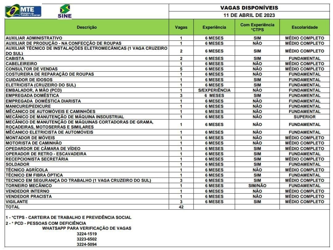 O Sistema Nacional de Emprego do Acre (Sine), está ofertando 42 vagas de emprego para esta terça-feira, 11. Dessas, 18 são para quem possui nível fundamental, 23 para nível médio e uma para nível superior completo. Além disso, três destas vagas são destinadas para a cidade de Cruzeiro do Sul e uma para pessoa com deficiência (PCD).