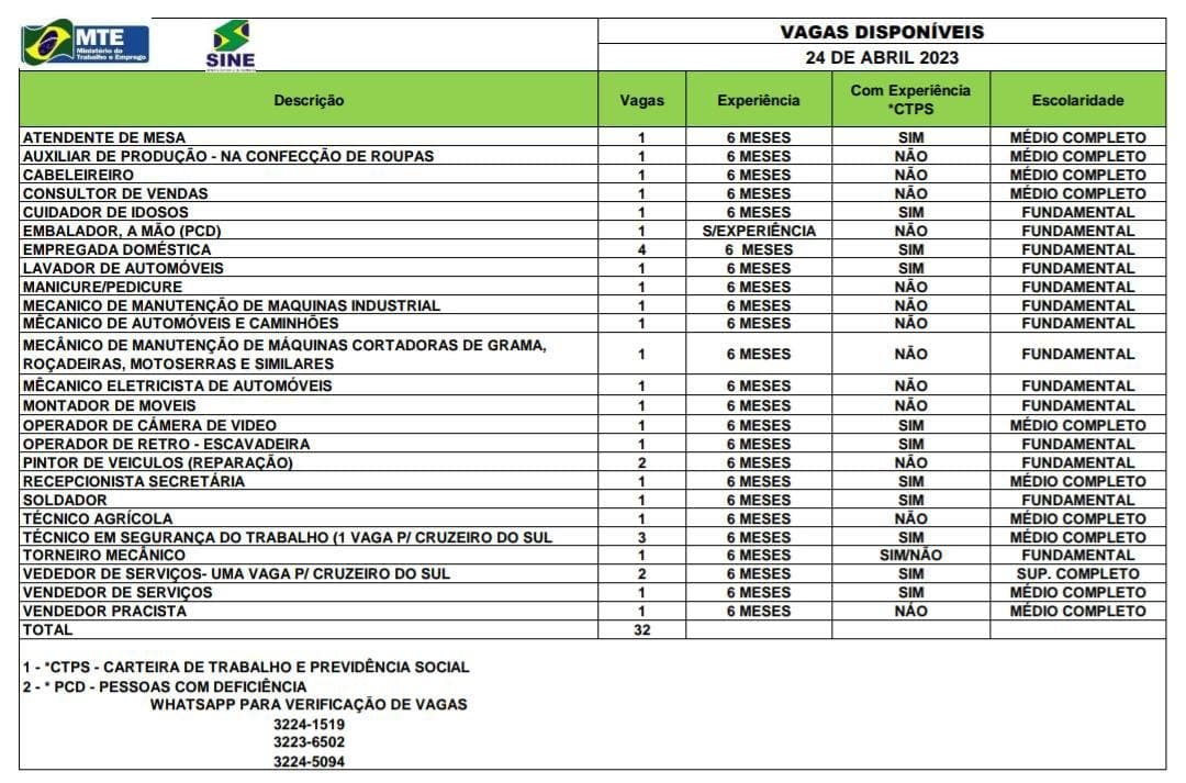 O Sistema Nacional de Emprego do Acre (Sine), está ofertando 32 vagas de emprego para esta segunda-feira, 24. Dessas, 18 são para quem possui nível fundamental, 12 para nível médio e duas para nível superior. Além disso, duas destas vagas são destinadas para a cidade de Cruzeiro do Sul e uma para pessoa com deficiência (PCD).
