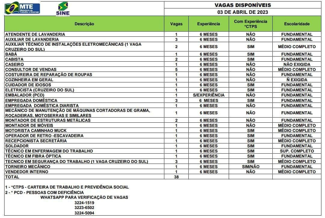 O Sistema Nacional de Emprego do Acre (Sine), está ofertando 38 vagas de emprego para esta sexta-feira, 30. Dessas, 20 são para quem possui nível fundamental, 15 para nível médio e uma para nível superior completo e duas não exigem nível de escolaridade algum. Além disso, três destas vagas são destinadas para a cidade de Cruzeiro do Sul e uma para pessoa com deficiência (PCD).
