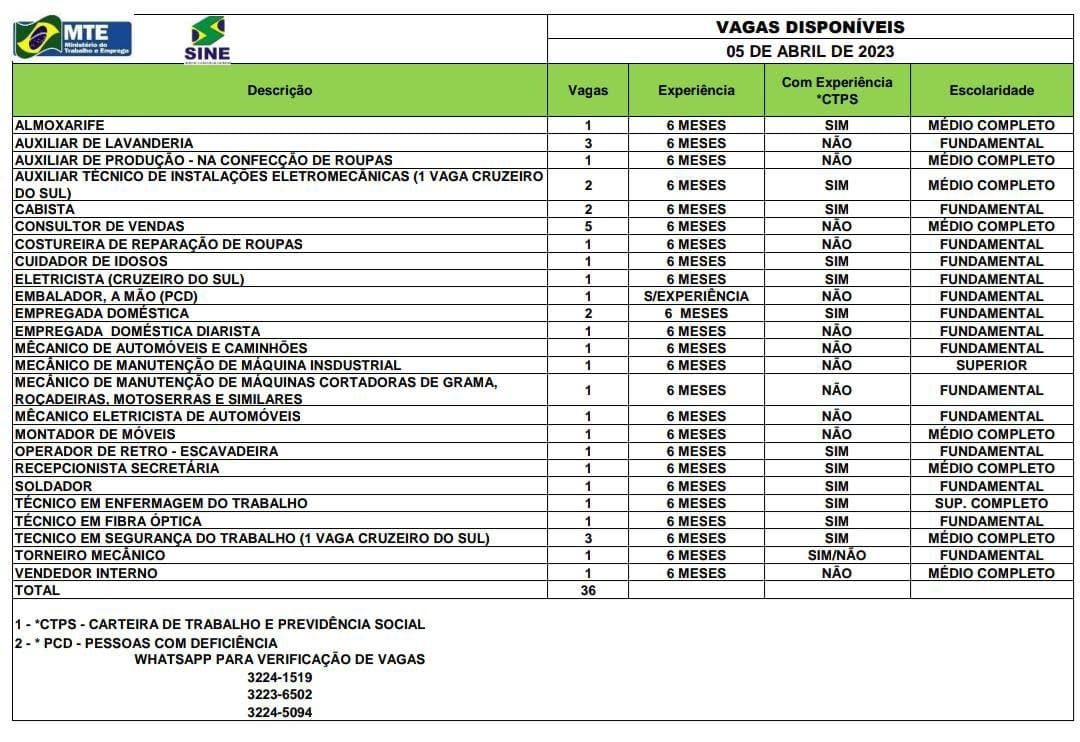O Sistema Nacional de Emprego do Acre (Sine), está ofertando 36 vagas de emprego para esta quarta-feira, 5. Dessas, 19 são para quem possui nível fundamental, 15 para nível médio e duas para nível superior completo. Além disso, três destas vagas são destinadas para a cidade de Cruzeiro do Sul e uma para pessoa com deficiência (PCD).