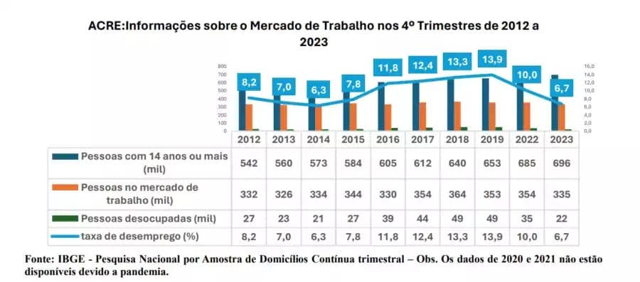 No quarto trimestre de 2023, o Instituto Brasileiro de Geografia e Estatística (IBGE) divulgou que a taxa de desocupação no Acre foi de 6,7%, um aumento de 0,5 ponto percentual em relação ao trimestre anterior (6,2%) e uma queda significativa de 3,3 pontos percentuais em comparação ao mesmo período de 2022 (10,0%). Analisando os dados, é possível observar que o quarto trimestre de 2023 registrou a segunda menor taxa de desemprego da série histórica, ficando atrás apenas do quarto trimestre de 2014, que registrou 6,3%.