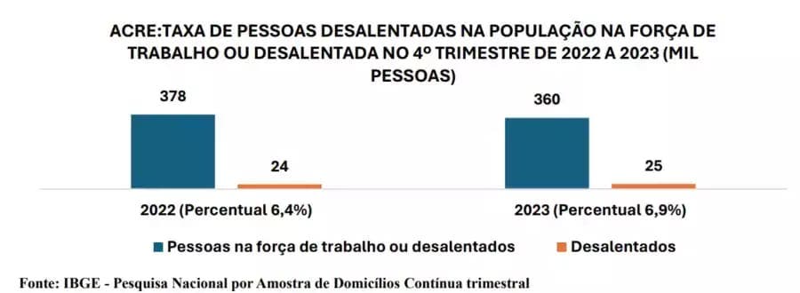 No entanto, houve um aumento na taxa de desalentados, que são pessoas que gostariam de trabalhar, mas não procuram emprego por acreditar que não encontrariam oportunidades. No quarto trimestre de 2023, a taxa de desalentados foi de 6,9%, um aumento em relação ao ano anterior (6,4%), resultando em um aumento no número de desalentados de 24 para 25 mil.