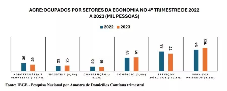 No entanto, apesar da queda na taxa de desemprego, houve uma diminuição na população ocupada do Acre, que caiu 1,6% de 318 mil em 2022 para 313 mil em 2023. Setores como Agropecuária, Serviços Públicos e Construção registraram perdas de empregos entre 2022 e 2023. A Agropecuária teve uma queda de 19,4% com a perda de 7 mil vagas, os Serviços Públicos perderam 9 mil vagas (10,5% de queda) e a Construção perdeu mil vagas (queda de 5%). Por outro lado, setores como Indústria (8,7% de crescimento), Serviços Privados (8,5% de crescimento) e Comércio (3,4% de crescimento) apresentaram um aumento no número de empregos.